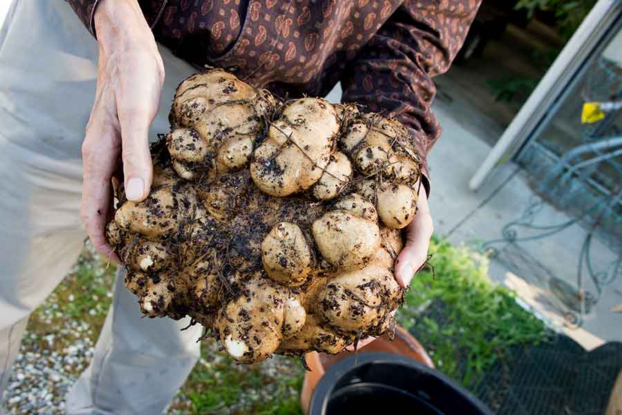 Dylan Hannon, curator of The Huntington’s conservatory and tropical collections, holds a large Corpse Flower corm in his hands.