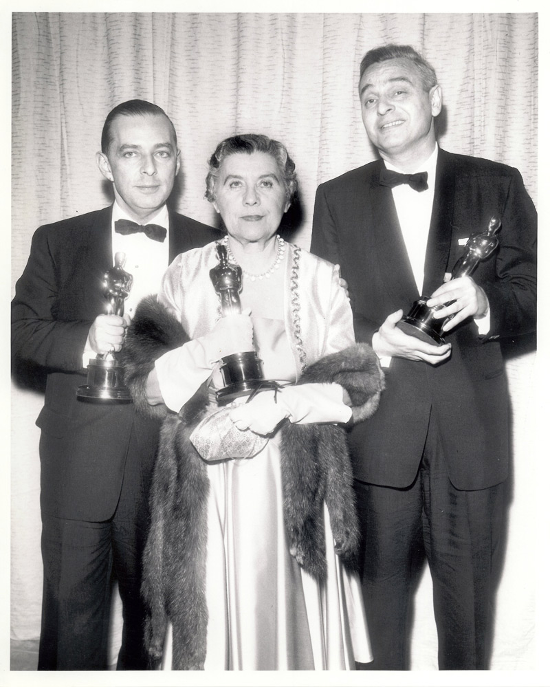 Sonya Levien and William Ludwig (far right) at the 1956 Academy Awards. The man on the left is unidentified. Huntington Library, Art Collections, and Botanical Gardens.