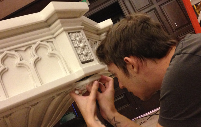 Wes Ivazes makes some final adjustments to one of the chandeliers.