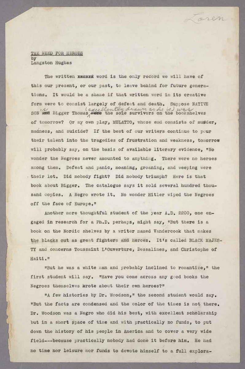 Corrected draft of “The Need for Heroes,” an essay by Langston Hughes. The Huntington Library, Art Museum, and Botanical Gardens.