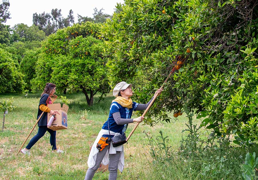 Food Forward volunteers work in a variety of places: They glean fruit from backyard fruit trees and public gardens and also rescue unsold food from local farmers markets and the Los Angeles Wholesale Produce market. Harvests that take place in The Huntington’s groves are among the most popular. “It’s great because there’s a lot of fruit to pick,” says Dory Bennett, Food Forward’s San Gabriel Valley backyard harvest coordinator. “We have volunteers who, year after year, specifically want to come to this harvest.”