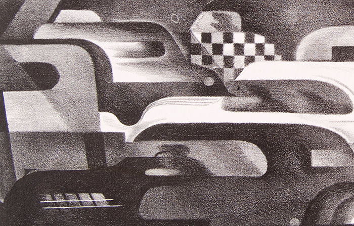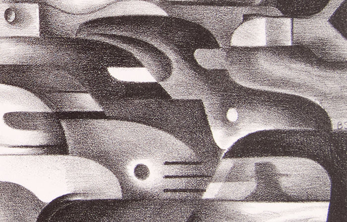 At first glance, the cars’ irregular rhythms feel static. They’re stuck waiting for a light to change or an impediment to be removed. However, if you keep looking, they start sliding around each other, darting this way and that. Nothing really moves—this is a lithograph, not a motion picture—but the artist gets at that peculiar way congested traffic seems to be frozen, even as cars trundle imperceptibly forward, nerves fray, and patience wears thin. Put another way, Spruance’s cars are standing still and still moving. I wonder if he ever lived in Los Angeles?