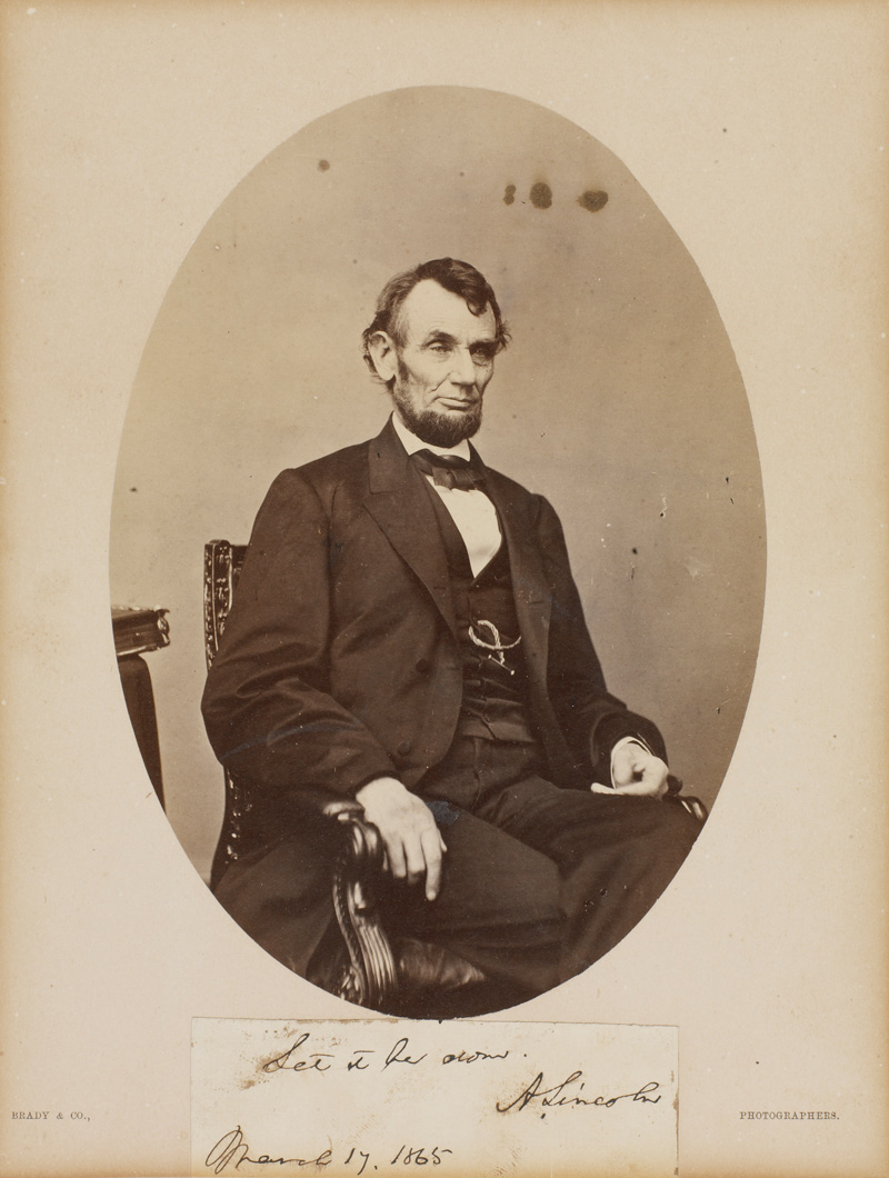 Photograph of Abraham Lincoln includes a handwritten note reading "Let it be done," signed and dated by Lincoln on March 17, 1865. (The photograph itself was taken in 1864 at Matthew Brady's Washington D.C. studio by his partner, Anthony Berger. It is known as the "five dollar pose," because the likeness was used as the basis for the engraving on the $5 bill.) Huntington Library, Art Collections, and Botanical Gardens.