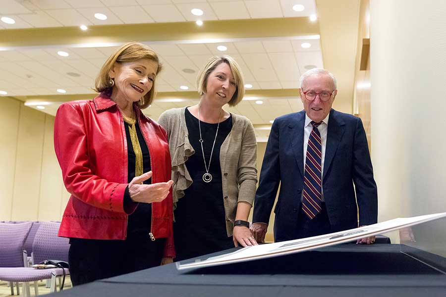 Melinda McCurdy in 2018 with donors Nancy Berman (left) and Alan Bloch (right), looking at a selection of prints by artist Henry Moore, part of a gift from the Philip and Muriel Berman Foundation. Photo by Sarah Golonka.