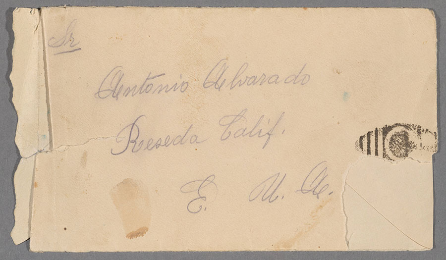 Back of the envelope of a letter from Ysidro Alvarado to his father, Antonio Alvarado, March 6, 1926. The Huntington Library, Art Museum, and Botanical Gardens.