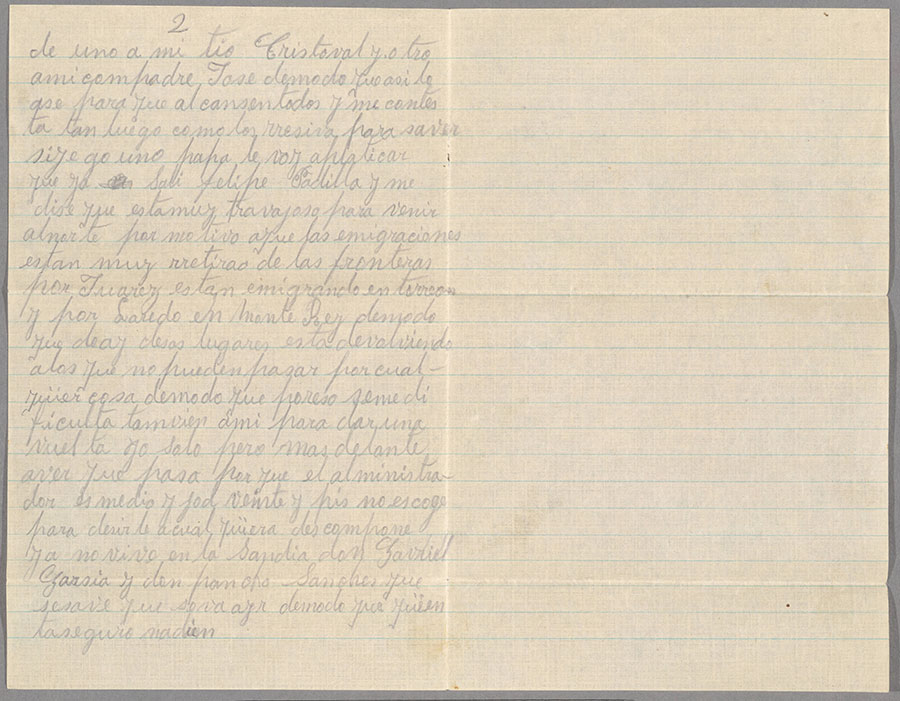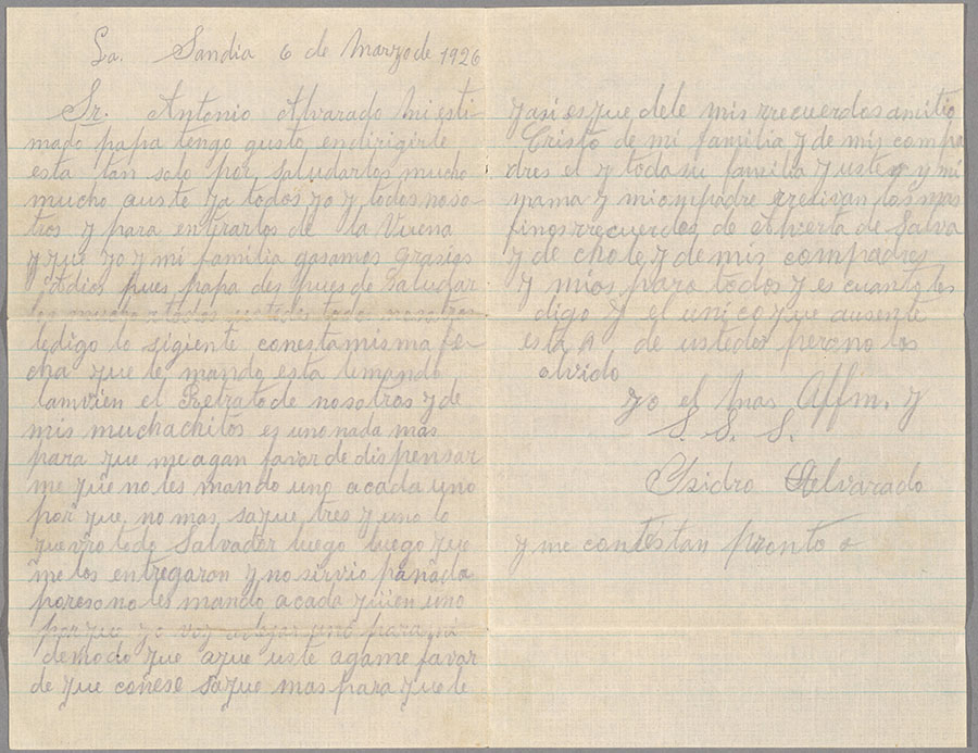 In the case of the Alvarado collection, Antonio’s son Ysidro, living in La Sandia, wrote many of the letters. Other relatives in the vicinity of La Sandia also wrote, and the collection includes letters to Antonio from fellow migrants in Southern California. The letters’ lengthy salutations, references to health, and mentions of such family milestones as baptisms speak to their sentimental value, but the letters also yield rich historical information. Dated March 6, 1926, the first letter, from son Ysidro to father Antonio, details routes of migration, in this case from León to the U.S.-Mexico border at Nuevo Laredo, and the reception once there. Ysidro refers to the United States simply as “el Norte” (the North).