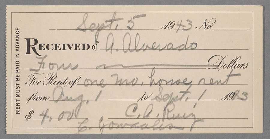 A rent receipt for Antonio Alvarado, who lived in Reseda, California, Sept. 5, 1943. The Huntington Library, Art Museum, and Botanical Gardens.