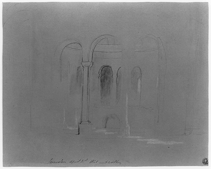 David Wilkie, Interior in Jerusalem, 1841, black and white chalk on gray paper [rendered here in a black-and-white photograph], Gilbert Davis Collection. The Huntington Library, Art Collections, and Botanical Gardens.