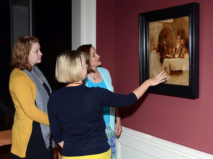 Tooey Durning (right) views the newly installed Supper at Emmaus at the Huntington Art Gallery with Melinda McCurdy (center), associate curator of British art, and Christina O’Connell (left), senior paintings conservator. Photograph by Lisa Blackburn.