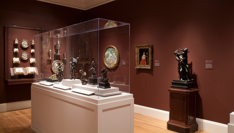 Catherine Hess, chief curator of European art, had several reasons to reinstall three of the rooms in the Huntington Art Gallery, which previously had displayed these early works in addition to French 18th-century art. (The French material will get a new gallery soon, as the reinstallation project continues into next year.) First, there were some recent acquisitions to put on view, including an Italian Renaissance wood sculpture, St. George and the Dragon, attributed to Giovan Angelo del Maino; and a series of 17th-century Flemish and German fruitwood carvings. Plus, there was a rare, early (late 17th- or early 18th-century) bronze cast of Bernini’s Pluto and Persephone, which had been in the Trustees’ room of the Library building, seldom accessible to visitors. “This cast is exquisite, deserves further study, and should be on display,” said Hess. Also, in that gallery, the collection of bronze statuettes are installed in a case in the middle of the room so that visitors can see the sculptures in the round to appreciate their dynamic compositions.