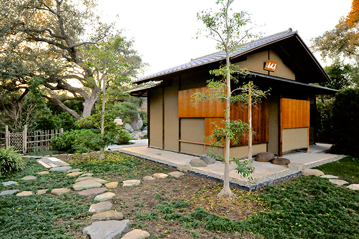 Takuhiro Yamada envisioned mature Japanese pine trees framing the Seifu-an teahouse. When he couldn’t find them, he chose two mochi trees (Ilex integra), a type of holly native to central and southern Japan, seen here to the left of the structure. Photo by Andrew Mitchell.