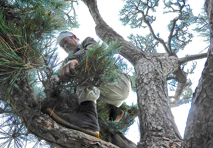 To trim a mature Japanese pine tree, Tomohiko Kawamura had to clamber up a ladder to reach inside its clusters of branches. Photo by Andrew Mitchell.