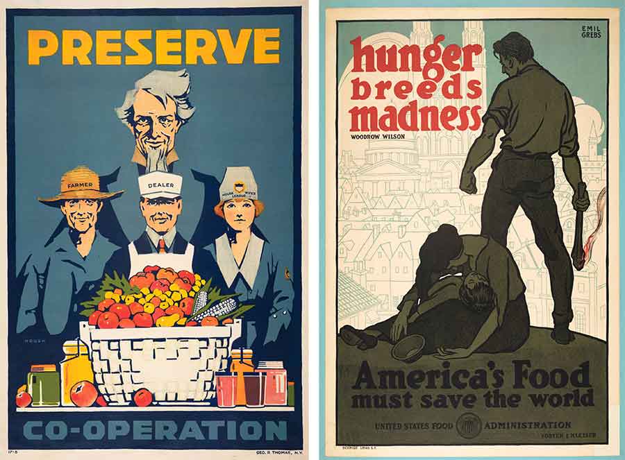 Carter Housh, Preserve Co-Operation, 1917 (left) and Emil Grebs, Hunger Breeds Madness, 1918. The Huntington Library, Art Museum, and Botanical Gardens. Posters encouraging the growing and preservation of food were disseminated during both World War I and II. Carter Housh designed five Preserve posters for the National Commercial Gas Association; these were distributed by gas companies in over 200 cities.