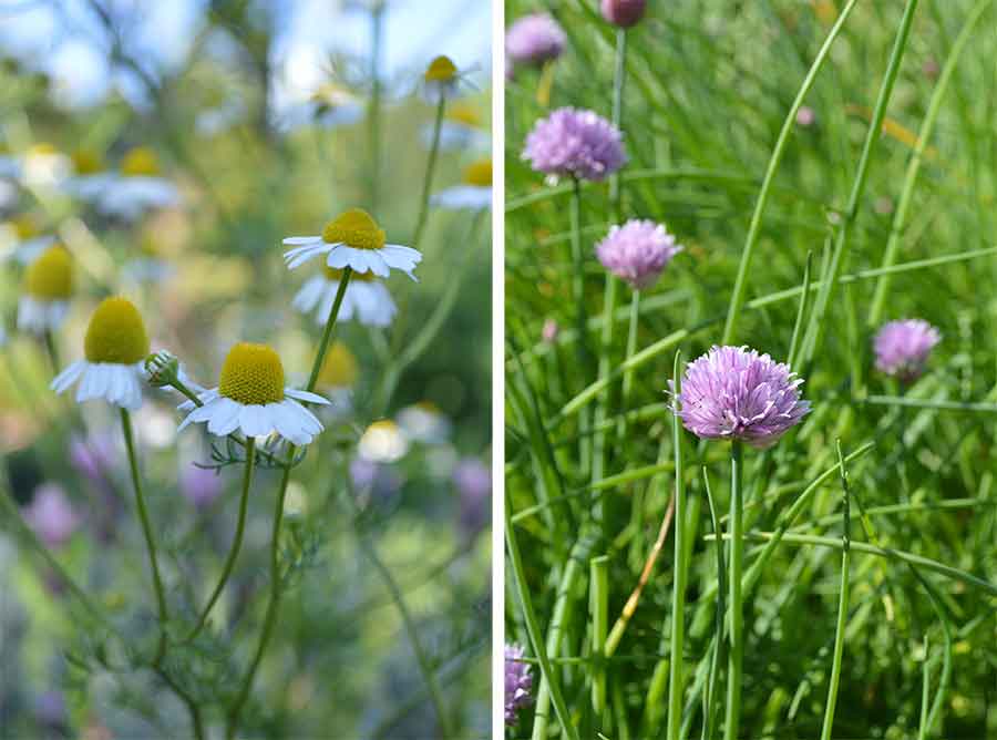 Chamomile (left) and chives (right) growing in The Huntington’s Herb Garden. These herbs  are not only useful in the kitchen, but also add lovely flowers to any garden space. Photos by Kelly Fernandez.