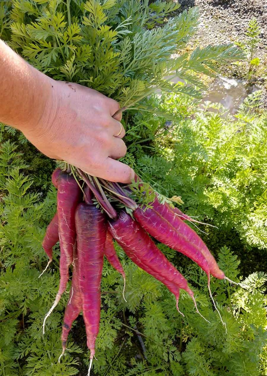 These vivid dragon carrots are an example of the many unique varieties of vegetables that can be difficult to find in stores but can be grown in home gardens. Photo by Cara Hanstein.