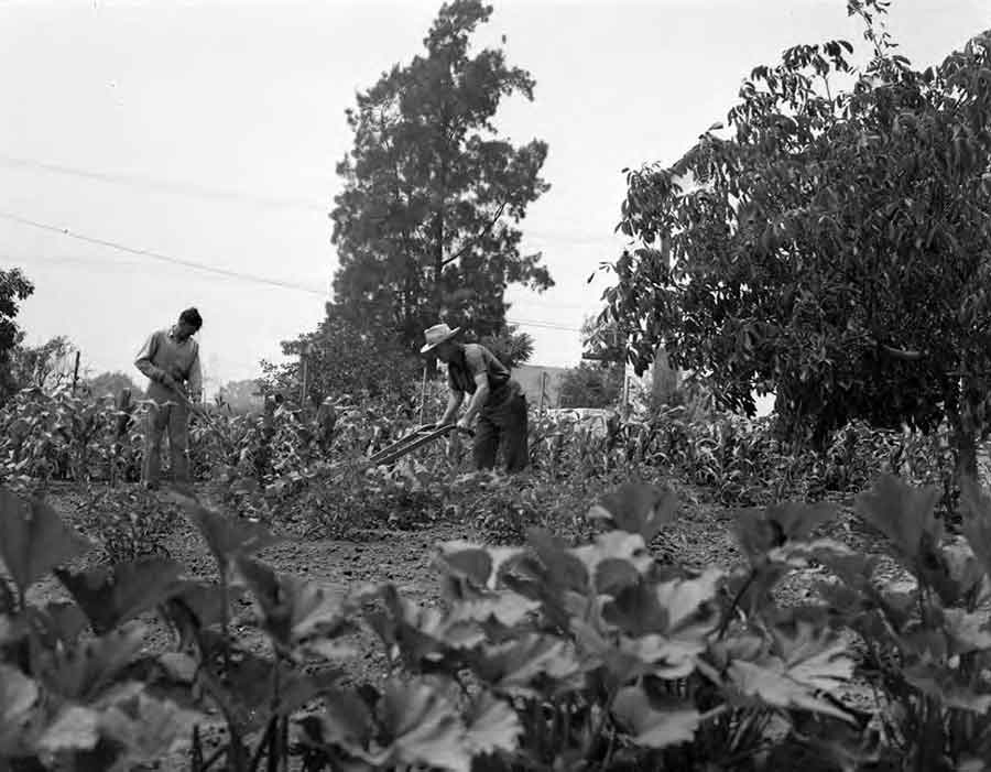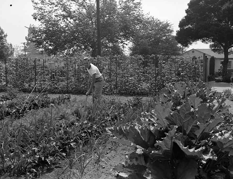 Burt E. Woodburn tending a victory garden during World War II. The Southern California Edison Photographs and Negatives Collection. The Huntington Library, Art Museum, and Botanical Gardens.
