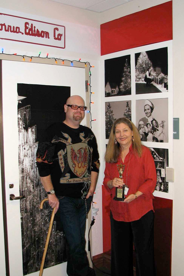 Steve Smith with Devonne Tice, library assistant in The Huntington’s image archives, standing in front of their department’s holiday door decoration in December 2007.