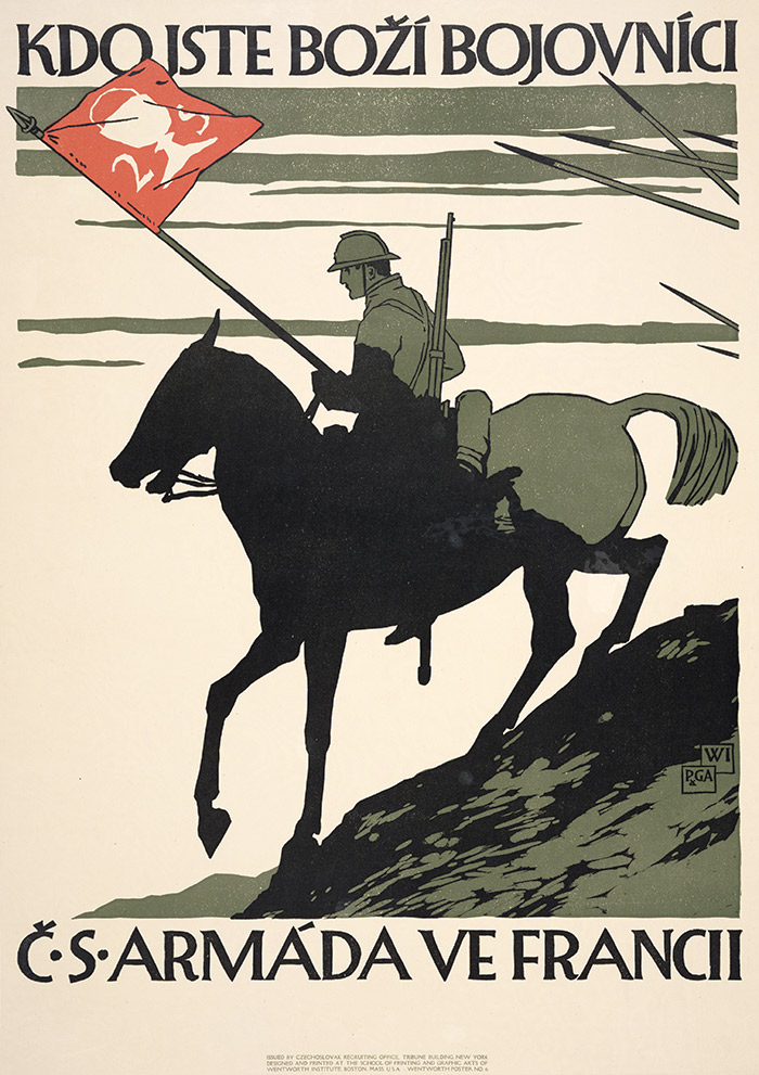 KDOJSTE BOZI BOJOVNICI / C.S. ARMADA VE FRANCII [Those Who Are God’s Warriors / Czechoslovak Army in France], ca. 1918. Vojtěch Preissig (1873-1944). United States, lithograph on paper, 30” x 21¼”. Gift of Jay T. Last. The Czechoslovak Recruiting Office in New York City distributed this poster urging Czech and Slovak volunteers living in the United States to join up. It was one of a series designed by the artist and printed at the center he directed, The School of Printing and Graphic Arts of Wentworth Institute in Boston. The Huntington Library, Art Collections, and Botanical Gardens.